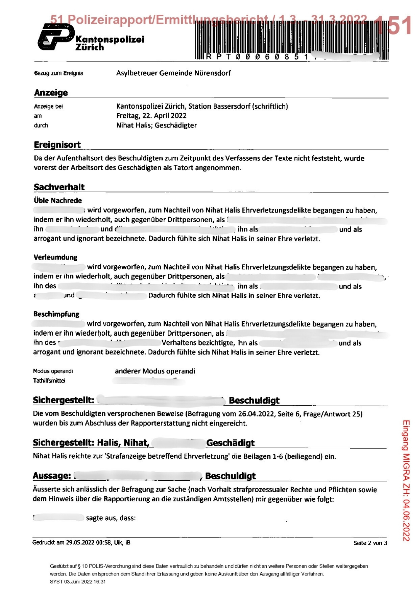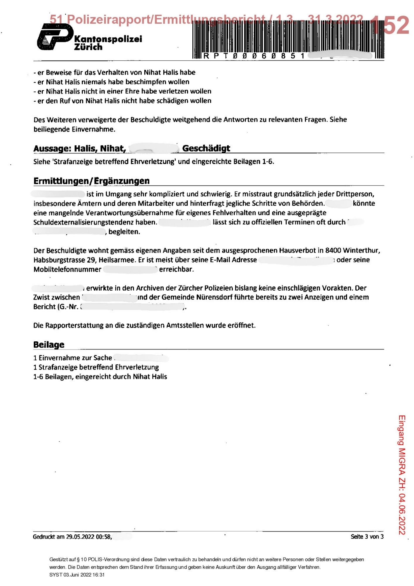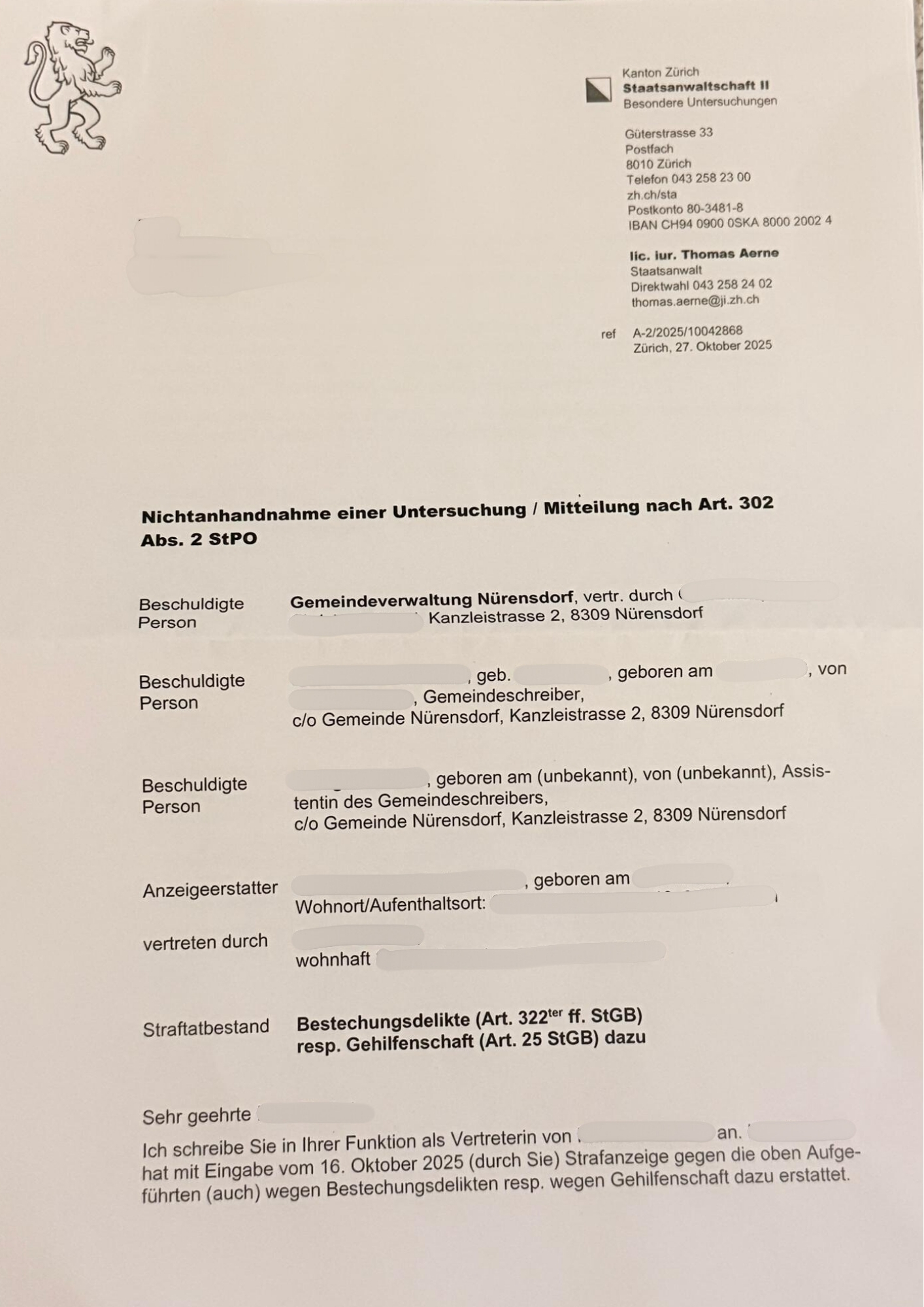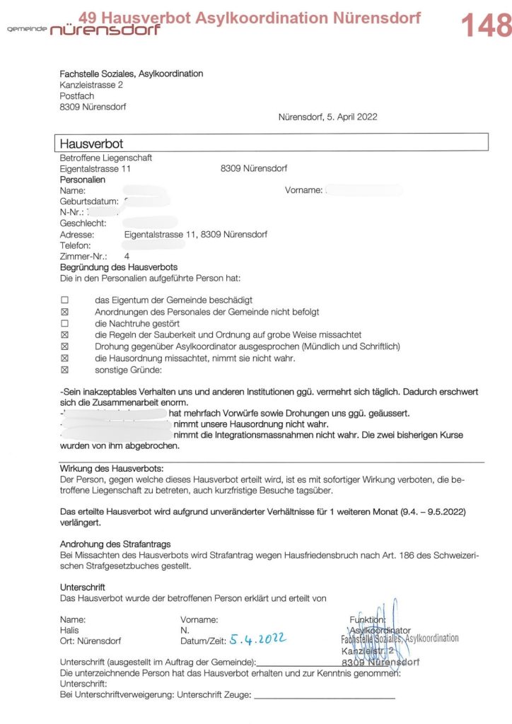Regarding the incident, the applicant submitted a complaint against Herr. Halis and Gemeinde Nürensdorf, and the case is still pending with the Public Prosecutor Office of Winterthur Unterland. Some communication between Gemeinde Nürensdorf and the residents is now held by the Sozialamt Kantonales Zürich. When the victim’s legal representative requested Akteneinsicht, Sozialamt Kantonales Zürich responded with what the applicant calls “cheap excuses”.