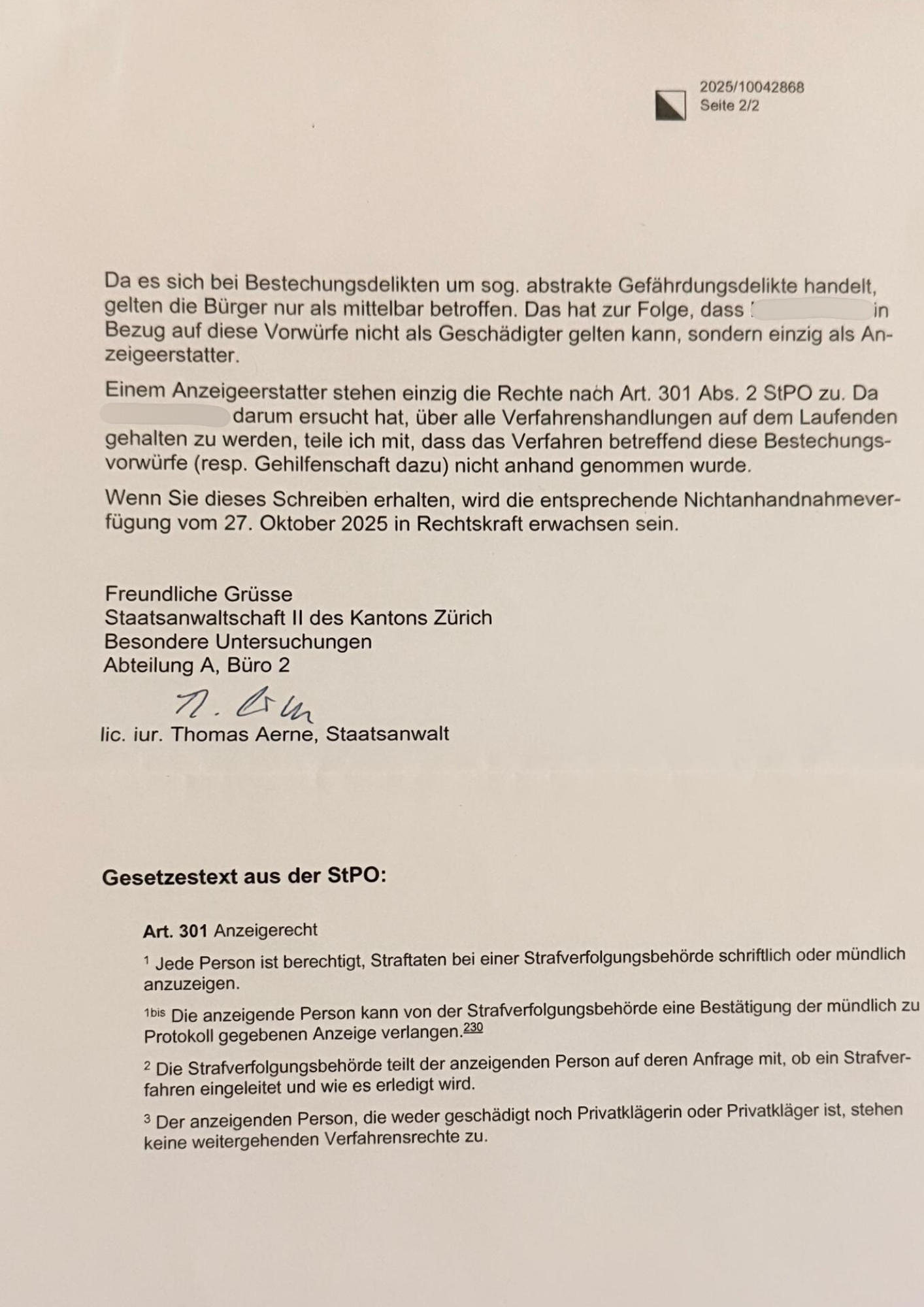 A noteworthy detail is that the decision failed to include any information about the right to appeal. Click to read the decision last page. This omission raises serious concerns for the applicant regarding the transparency of the process and the apparent level of institutional protection enjoyed by certain officials in the Canton of Zurich, which in turn casts doubt on the integrity of the Swiss judiciary system. In fact, Helvilux previously published an article titled “A Troubling History: When Swiss Prosecutors Themselves Faced Corruption Allegations” shedding light on similar concerns. Click to read the article.