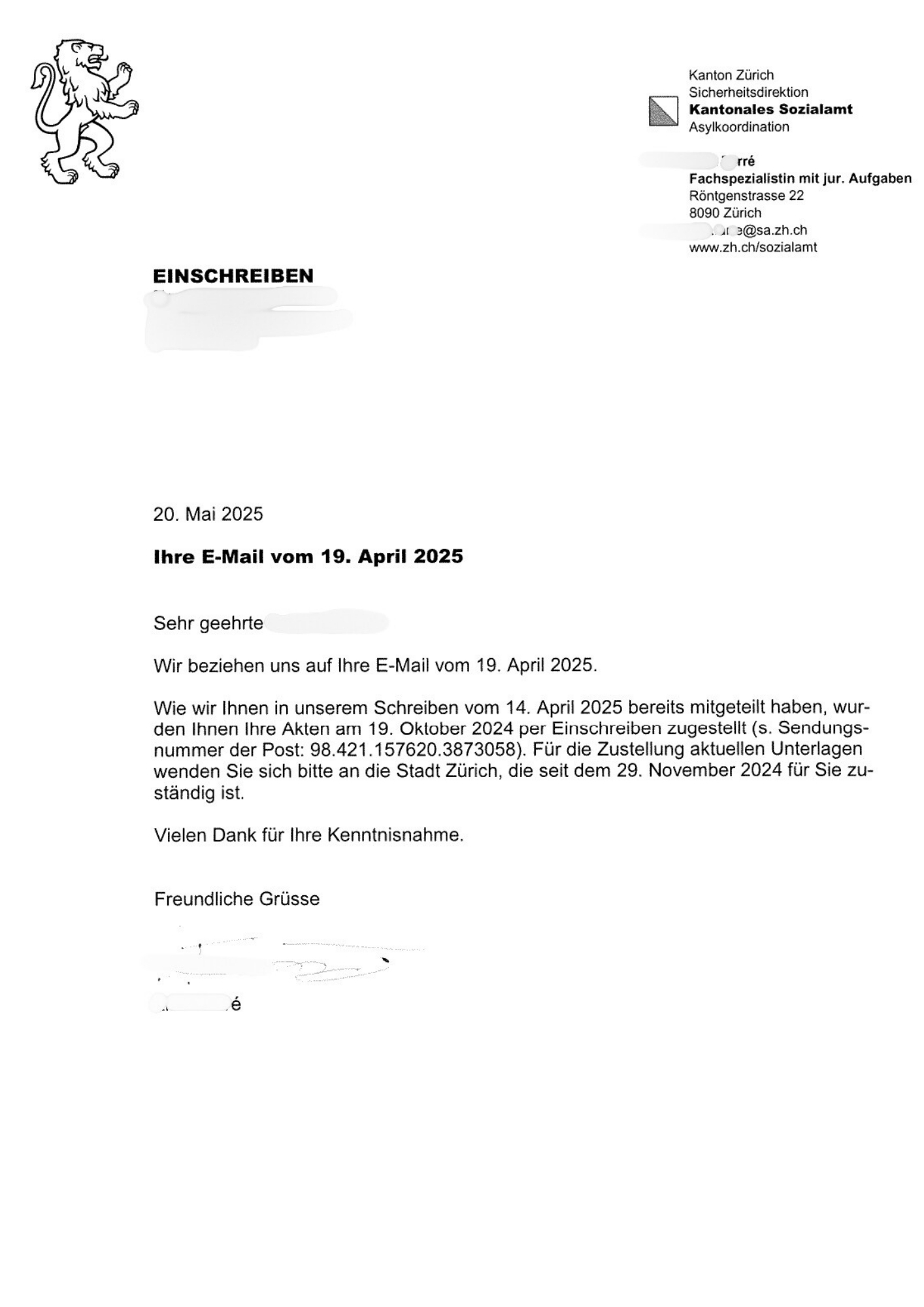 In one letter, the Sozialamt Kanton Zürich claimed that they had sent the requested files (Akteneinsicht) by registered mail. Countering this, the applicant’s legal representative said, “This is how they (authority) create drama. They send some ordinary documents while withholding the complete file, then use the postal receipt as ‘evidence’ that the files were delivered.” For this reason, the representative always requests digital copies via email, because postal delivery allows the authority to exploit loopholes. With digital copies, at least there is clear evidence if the authorities fail to provide the complete files.