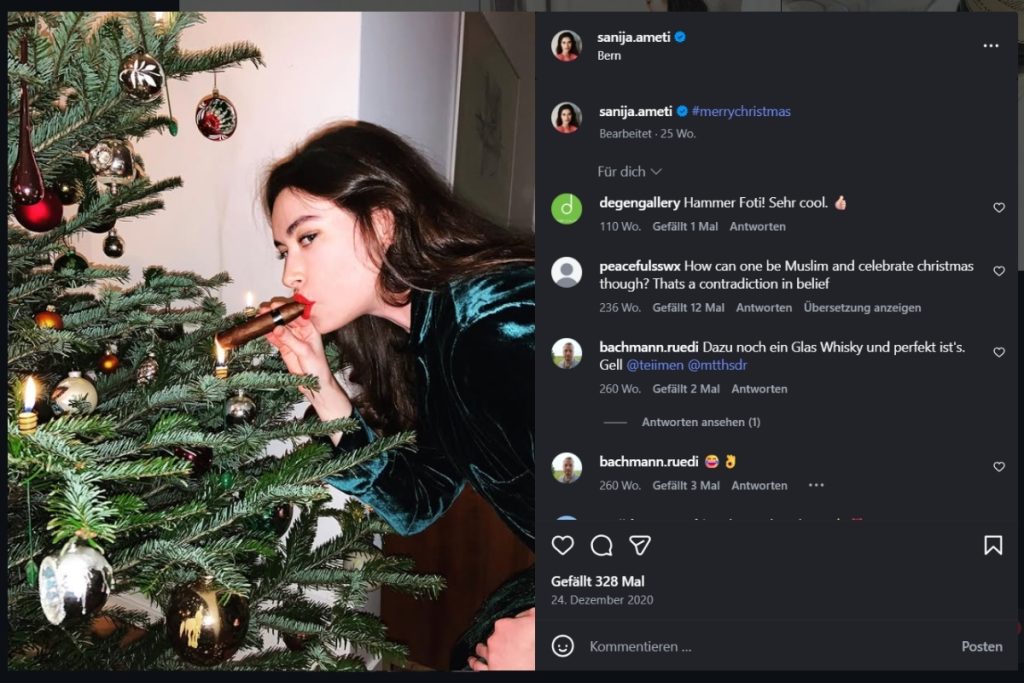 Helvilux is not engaging in assumptions or speculation. In an interview conducted by Watson several months later after the incident, Ameti herself admitted that she had made a mistake, which indicates that she was aware her actions were wrong. However, her current Instagram account still contains another image in which she appears to be lighting a cigar using a candle hanging on a Christmas tree. A Christmas tree, which again is related to Christian society. How on earth could she think it was acceptable to light a cigar from a Christmas tree candle? This is not an exercise of freedom of speech, but a blatant mockery of the law in Switzerland. This imagery clearly suggests that Ameti continues to show disregard for the feelings and religious sentiments of Christians in Switzerland while also upholding her personal conviction that she ought to be free to express herself liberally through freedom of speech. Therefore Helvilux, in the public interest, did submit a complaint to the Public Prosecutor of the canton of Zurich.