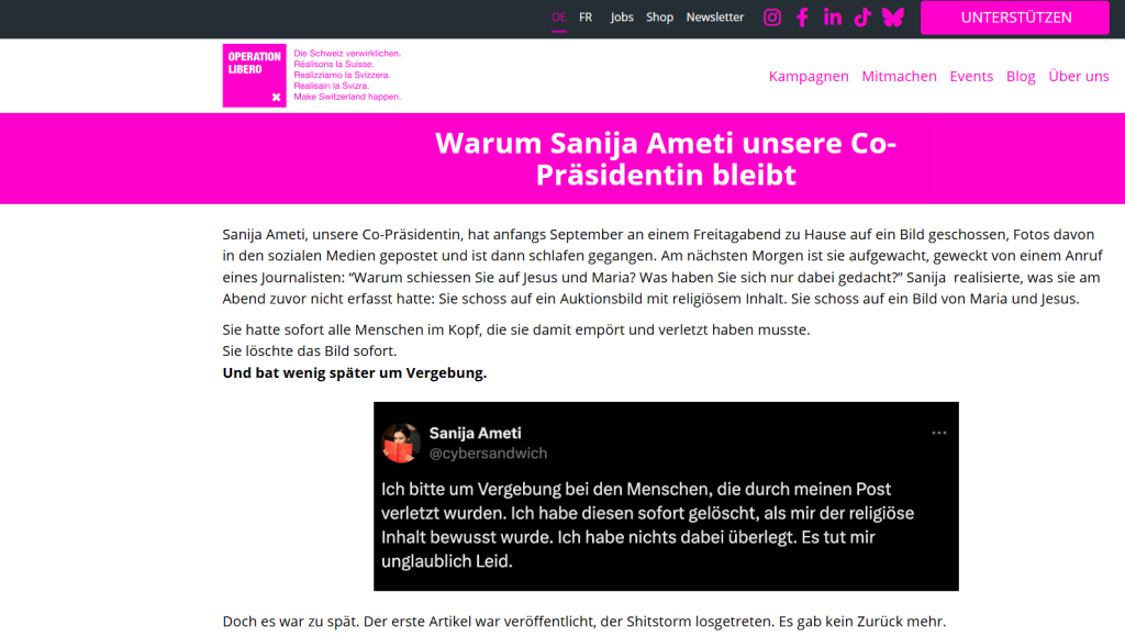 Accused politician Sanija Ameti accepted her mistake in media in 2024 but didnt shown any public apology in the court and also her action still shows different and Operation Libero have taken her side, portraying her as a victim even after she expressed her feelings and posted about the incident on her own social media. Operation Libero noted that on social media there is so much hate against her. But interesting that the same organisation can’t highlight how she herself sparked that reaction in people’s minds.