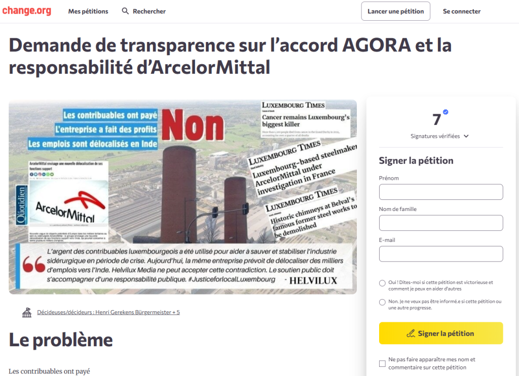 A Change.org petition launched by Helvilux Media highlights longstanding concerns over the lack of full public disclosure regarding the AGORA agreement, public funding for Luxembourg’s steel industry transition, ongoing environmental and health legacies, and recent plans by ArcelorMittal to relocate European support functions to India. The campaign, titled “Request for transparency on the AGORA agreement and ArcelorMittal’s responsibility” (link https://c.org/79MT64XyXG) argues that taxpayer-supported stabilization of the steel sector during crisis periods should entail clearer long-term commitments to employment, territorial responsibility, and cost accountability.