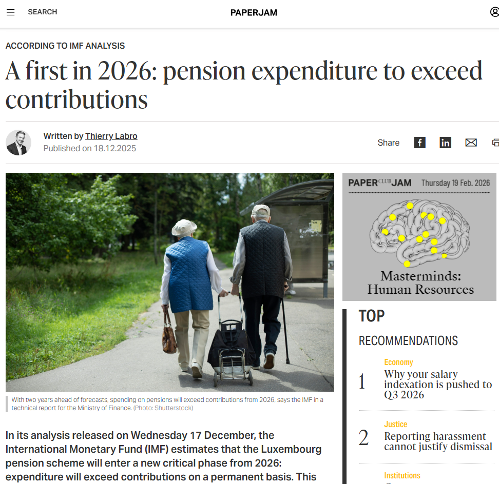 Recently, the editor-in-chief of Paperjam, Thierry Labro, noted in an in-depth article titled A First in 2026: Pension Expenditure to Exceed Contributions that, according to an analysis released on Wednesday, 17 December, the International Monetary Fund (IMF) estimates Luxembourg’s pension scheme will enter a new critical phase from 2026 onward, with expenditure permanently exceeding contributions. Also the Ministry of Health and Social Security in there website mentioned about the Pension System Adjustments from 2026. Click here to read