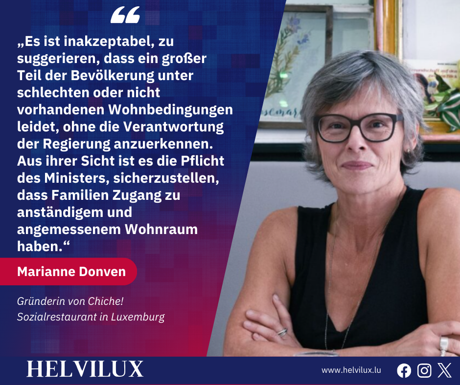 Donven kritisierte die Prioritäten der Regierung und stellte fest, dass Millionen oder sogar Milliarden in groß angelegte Projekte wie den Ausbau eines neuen Flughafens oder von Sporteinrichtungen fließen, während viele Familien keinen stabilen Wohnplatz haben. Sie betonte, dass dieses Problem zunehmend die nächste Generation der Luxemburger betreffen werde, die in den Arbeitsmarkt eintreten wird, während sie die Folgen von Obdachlosigkeit erleben. Laut Donven ist dringendes Handeln der Regierung erforderlich, um den Wohnungsmangel zu bekämpfen, bevor das Problem sich weiter verschärft.