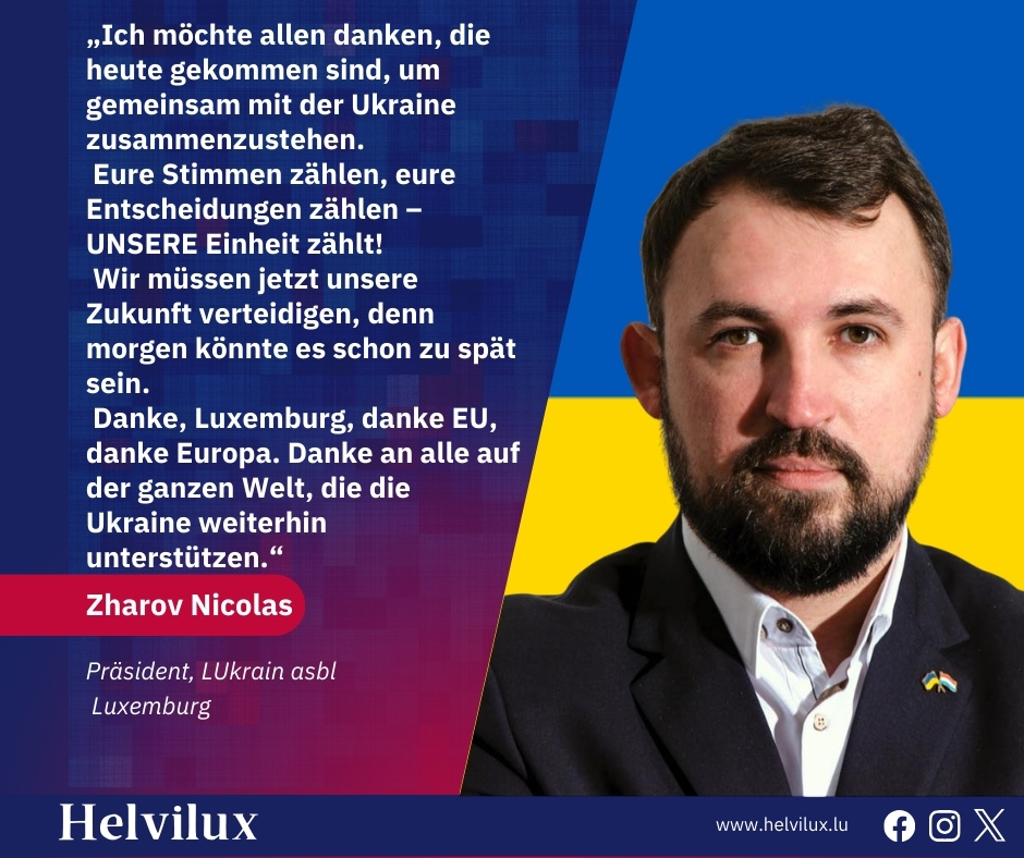 Die Veranstaltung endete mit einer Ansprache von Zharov Nicolas, Präsident von LUkraine asbl, der sich bei allen Unterstützern der Ukraine bedankte. Er sagte: „Ich möchte mich bei allen bedanken, die heute gekommen sind, um gemeinsam mit der Ukraine zu stehen. Eure Stimmen zählen, eure Entscheidungen zählen – unsere Einheit zählt. Wir müssen unsere Zukunft jetzt verteidigen, denn morgen könnte es zu spät sein. Vielen Dank an Luxemburg, vielen Dank an die Europäische Union und vielen Dank an alle Menschen auf der ganzen Welt, die die Ukraine weiterhin unterstützen.“